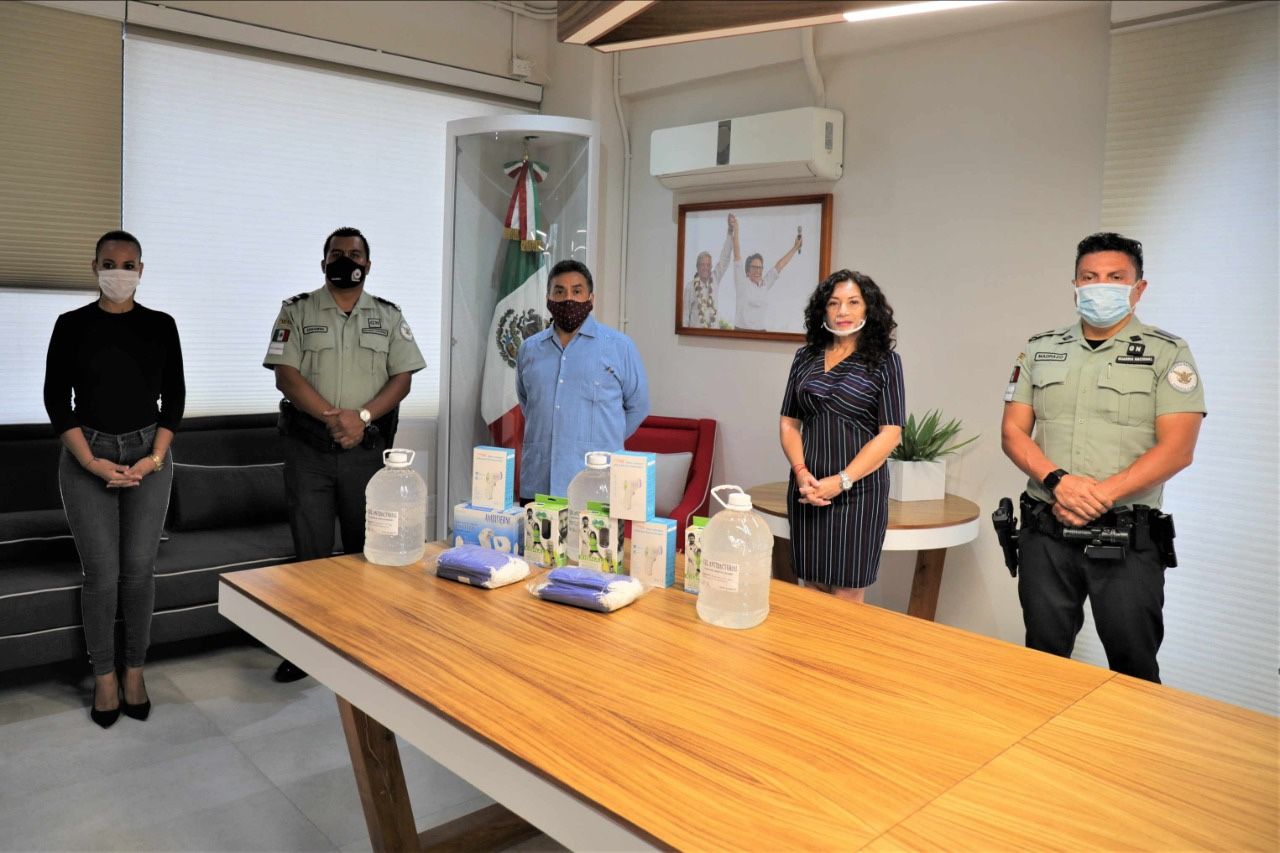 PLAYA DEL CARMEN, 23 de julio.- Este día se entregaron kids sanitizantes a representantes de la Guardia Nacional a cargo de la vigilancia en vialidades, en el marco de la campaña “Libre de Brotes” que impulsa la presidenta municipal de Solidaridad, Laura Beristain Navarrete.