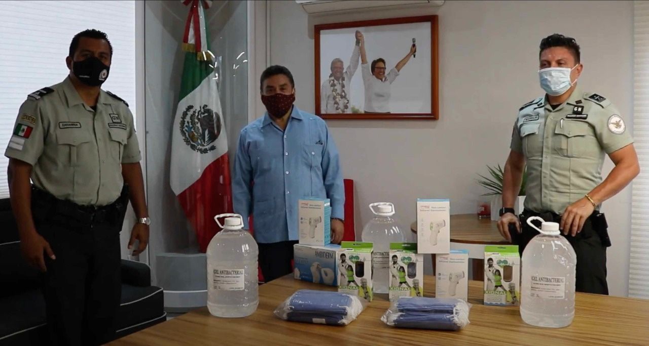 La entrega consistió en cubrebocas, así como en tres oxímetros de pulso, tres scanners infrarrojos para medir la temperatura, alcohol gel al 70% y guantes de látex, mismos que fueron recibidos por el oficial de la Guardia Nacional, José Francisco Ruiz Madrazo, encargado de la Subestación de la Coordinación de Batallón de Seguridad en Carreteras e Instalaciones en Quintana Roo de la Guardia Nacional y el Suboficial Sanabria González Arturo.