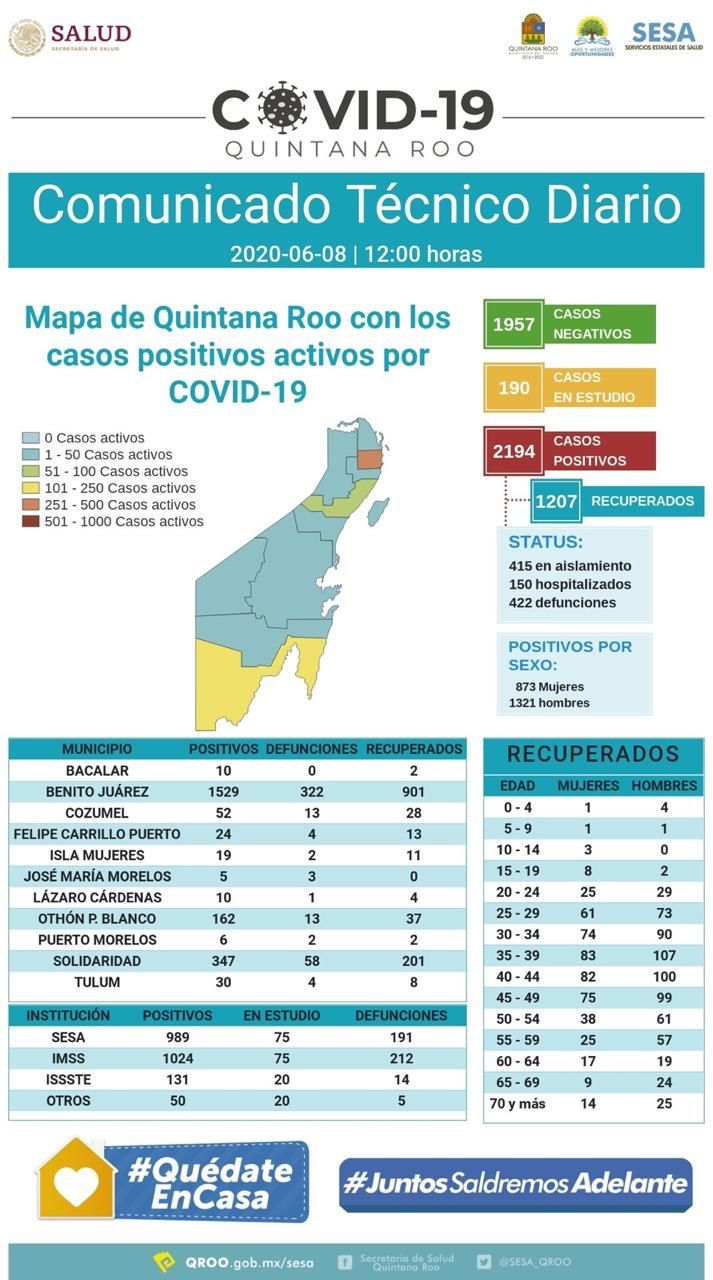 El comunicado técnico de la SESA, establece que Bacalar hay diez casos positivos y dos personas recuperadas, Benito Juárez, tiene 1,529 casos positivos, 322 defunciones y 901 recuperados, Cozumel, 52 casos, trece defunciones y 28 recuperados, Felipe Carrillo tiene 24 casos, cuatro muertos y trece personas recuperadas, Isla Mujeres, tiene 19 casos positivos, dos decesos y once recuperados, mientras que en José María Morelos, 5 casos y tres personas muertas.