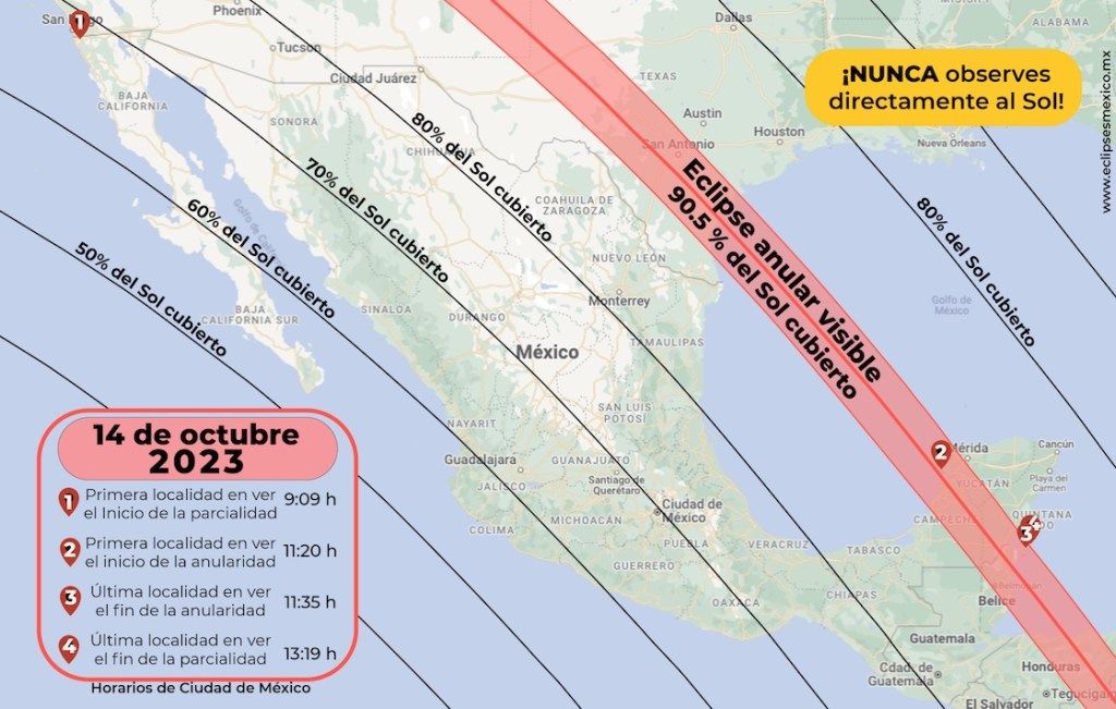 “Mapa de la visibilidad que tendrá el eclipse anular solar en México”.Foto: eclipsesmexico.mxSi están interesados en cachar este evento astronómico con una buena guía y un par de actividades, por acá les pasamos los lugares ideales.
