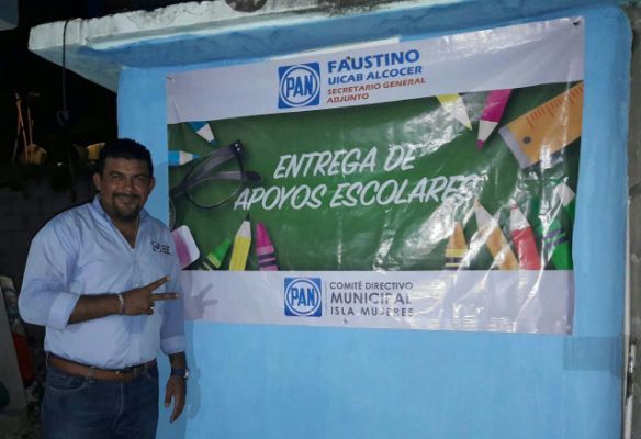 ISLA MUJERES, Quintana Roo, a 21 de agosto.- Faustino Uicab Alcocer, secretario estatal adjunto del Partido Acción Nacional (PAN), aprovecha la necesidad de los isleños para promover su imagen y al instituto político al que pertenece en la entrega de decenas de paquetes de útiles escolares.