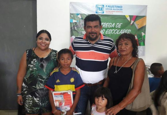 Sin embargo, además de su vanagloria en la que involucra a la presidenta del PAN municipal, Yasminda Medina; y al integrante del Comité Municipal, Romel Basto, quienes lo acompañaron en el reparto de útiles, en los paquetes se veían estampados la imagen de Faustino Uicab y el logo panista en una clara violación a las leyes electorales de Quintana Roo.
