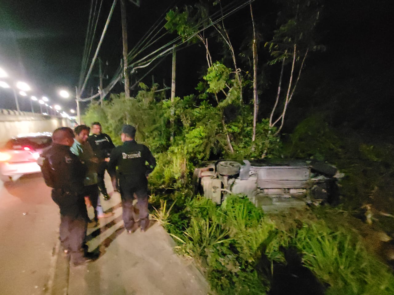 Al no controlar el automóvil, se monta en la guarnición, donde se lleva los letreros, y se proyecta hacia la maleza, en un lote baldío, para terminar volcado.