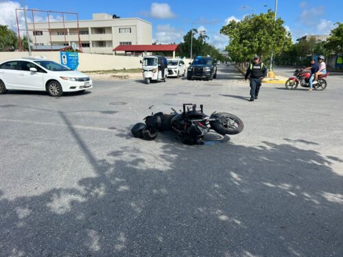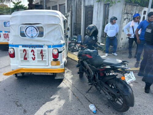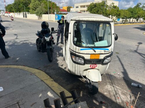 Playa del Carmen.– Una mujer de la tercera edad resultó lesionada luego de que el mototaxi en el que viajaba se viera involucrado en un accidente con una motocicleta, la mañana de este lunes en el fraccionamiento Villas del Sol.