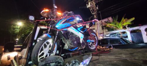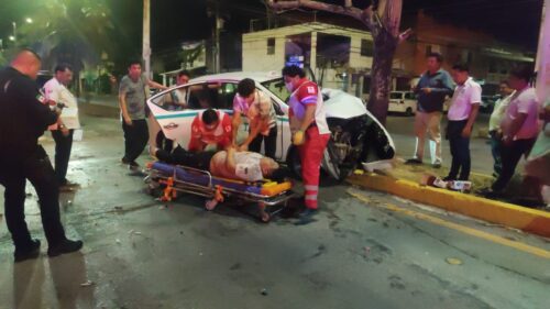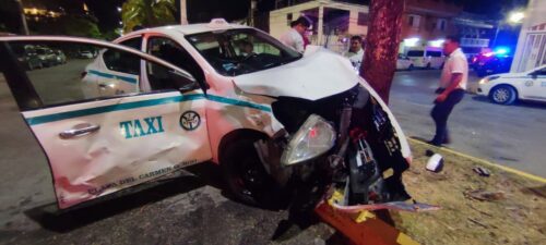 Playa del Carmen, Q. Roo.– Un aparatoso accidente registrado la madrugada de este miércoles en la colonia Gonzalo Guerrero dejó como saldo tres personas lesionadas, luego de que un motociclista se atravesara en la trayectoria de un taxi, provocando el impacto y la proyección de ambos vehículos hacia el camellón central.