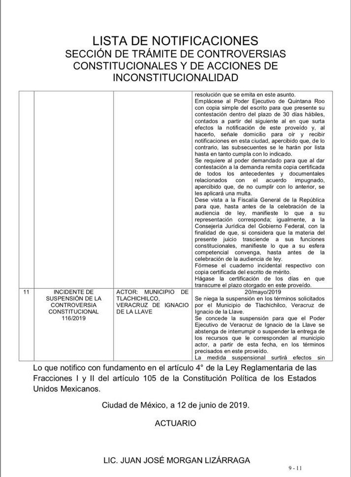 “Se tiene como demandado en este procedimiento constitucional al Poder Ejecutivo de Quintana Roo, el cual debe comparecer por conducto de su representante legal y, en su caso, dictar las medidas necesarias para dar cumplimiento a la resolución que se emita en este asunto”, se indica en la notificación.