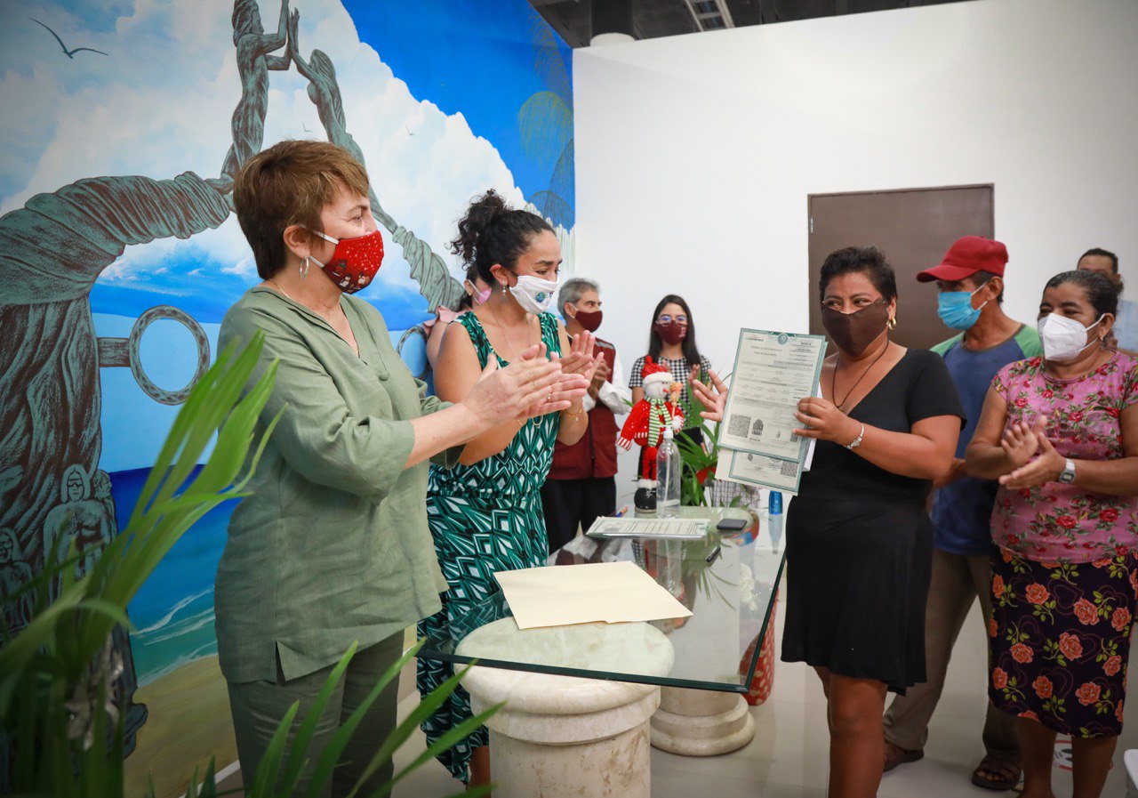PLAYA DEL CARMEN, Quintana Roo, 09 de diciembre del 2020.- Silvia Hernández Argüelles, de 35 años, recibió de manos de la presidenta Laura Beristain Navarrete su acta de nacimiento y agradeció el contar ahora con el documento que le permitirá realizar varios trámites. Todo esto sucedió en el programa “Todos Somos Solidaridad” que acerca trámites y servicios a todos los rincones del municipio.