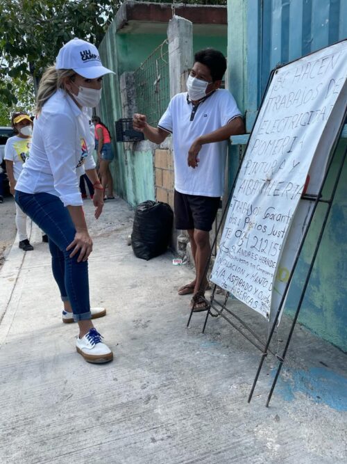 Siempre con cubrebocas, gel y manteniendo la sana distancia para protegerse y proteger a los demás, la candidata recorre diario las colonias de Solidaridad.