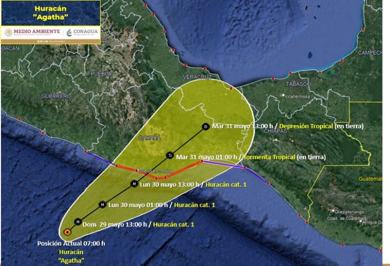 La proyección para Agatha indica que continuará como huracán de categoría 1 hasta el lunes por la tarde, cuando se ubique a 40 km al sur de Puerto Escondido, Oaxaca.