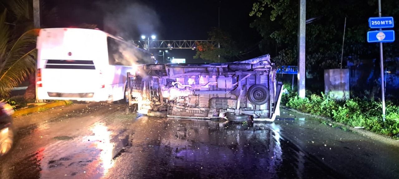 CANCÚN, Quintana Roo, 11 de agosto. – A poco más de que se desmantelara la “Casa de los Aluxes” en la vialidad que conduce al aeropuerto, esta noche se registró una aparatosa volcadura en la salida de Cancún rumbo a Playa del Carmen.