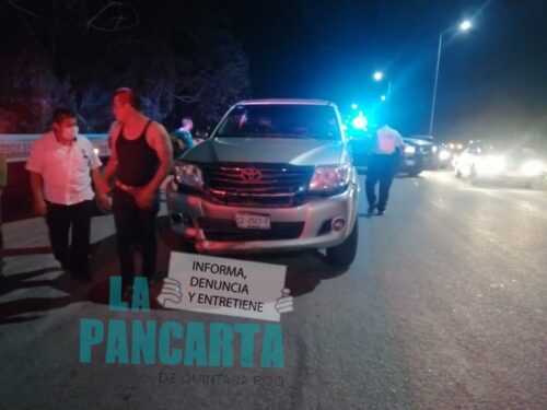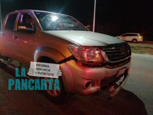 Se registró fuerte accidente sobre la autopista el Tintal-Playa del Carmen con Avenida Flor de Ciruelo, entre un taxi del sindicato Lázaro Cárdenas del río que circulaba con preferencia de paso sobre la autopista tintal y una camioneta marca Toyota color gris, la cual al intentar cruzar debajo del puente, entre carriles, la Avenida flor de ciruelo para dirigirse al fraccionamiento palmas dos, no midió su distancia por lo que impacto a la unidad de servicio público.