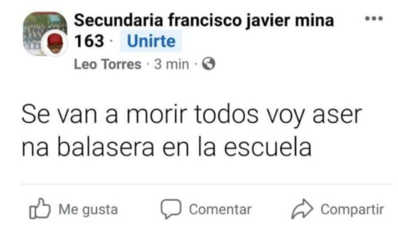 La noche del martes un supuesto alumno publicó en un grupo de Facebook que este miércoles realizaría una balacera en la Escuela Secundaria 163 ‘Francisco Javier Mina’.