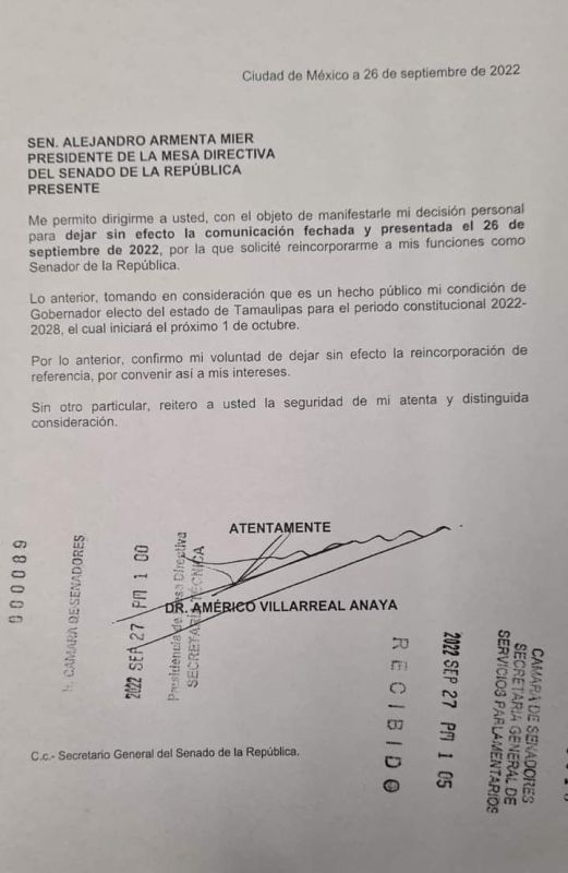 De acuerdo con el documento este fue recibido en el Senado la tarde del 27 de septiembre.