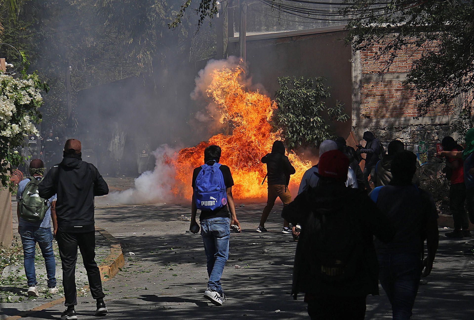 Aunque los agentes intentaron replegar a los normalistas, los jóvenes se organizaron en una segunda embestida para continuar con los destrozos.