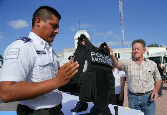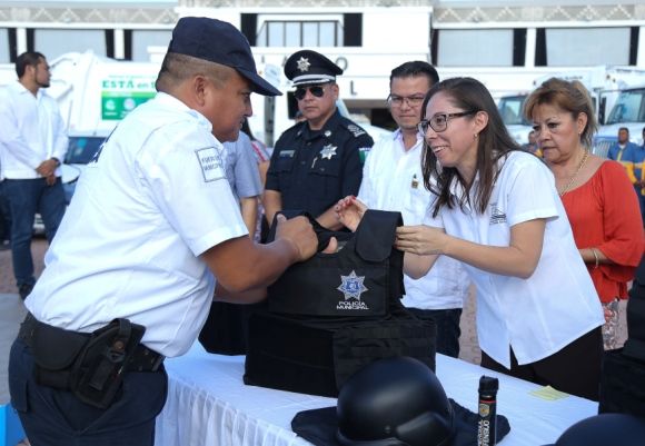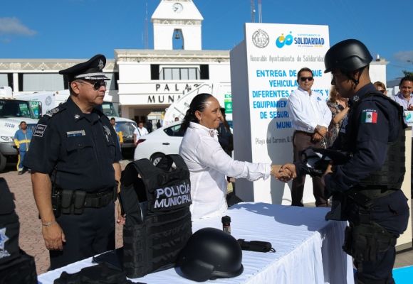 En presencia de representantes de las cámaras, asociaciones y colegios de empresarios y profesionales, el Gobierno de Solidaridad entregó chalecos antibalas, cascos y equipos de visión nocturna, entre otras herramientas para los elementos de la Dirección General de Seguridad Pública y Tránsito, con el fin de reforzar su protección en el cumplimiento de su deber.