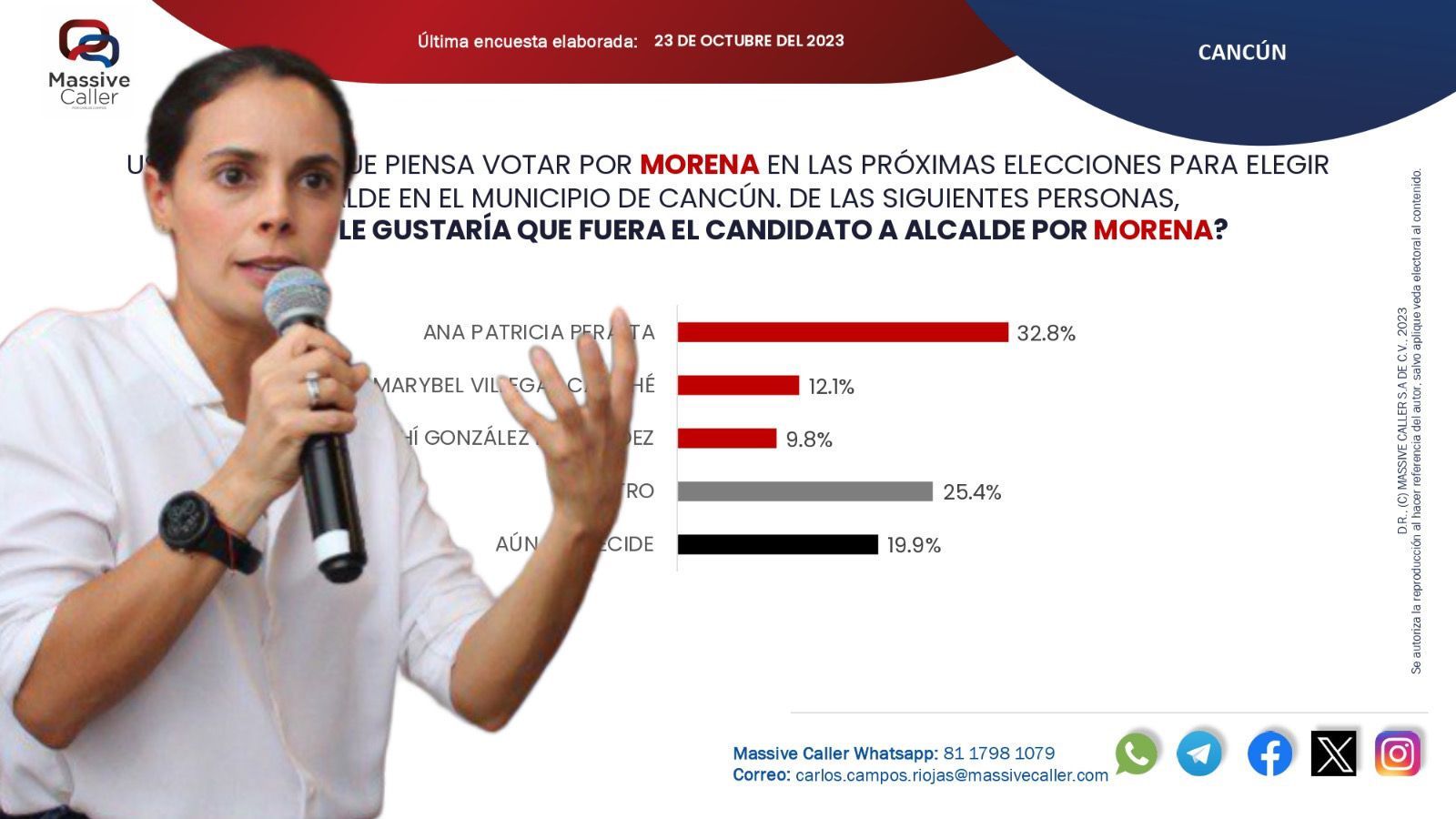 CANCÚN, Quintana Roo, 26 de octubre. – La presidenta municipal de Benito Juárez, Ana Patricia Peralta de la Peña, encabeza la encuesta Massive Caller Cancún 2023 con la intención al voto para las alcaldías en 2024 con más del 32.8%, arriba de otras aspirantes y perfilándose para la reelección en el Movimiento de Regeneración Nacional (Morena).