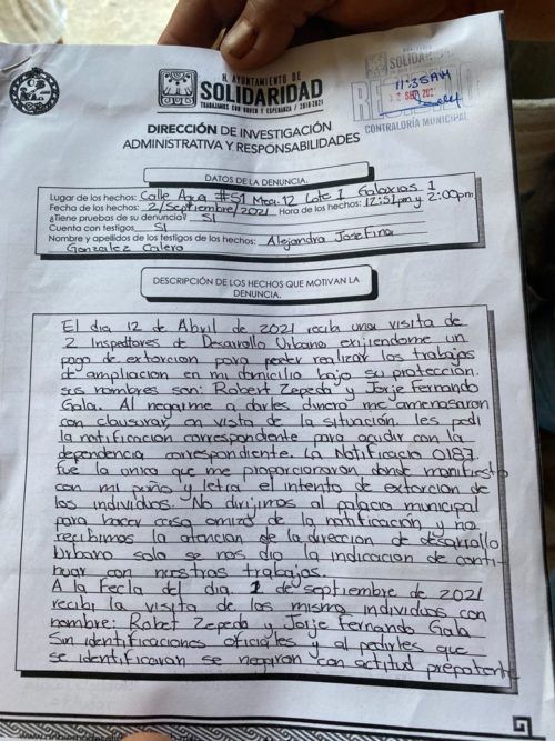 La denuncia fue presentada ante la Contraloría del H. Ayuntamiento de Solidaridad por la ciudadana Alejandra Josefina González Calera y su esposo, Santiago Domínguez, quienes dijeron que los servidores públicos se presentaron a su vivienda, así como a la de otros vecinos de la zona habitacional en busca de dinero.