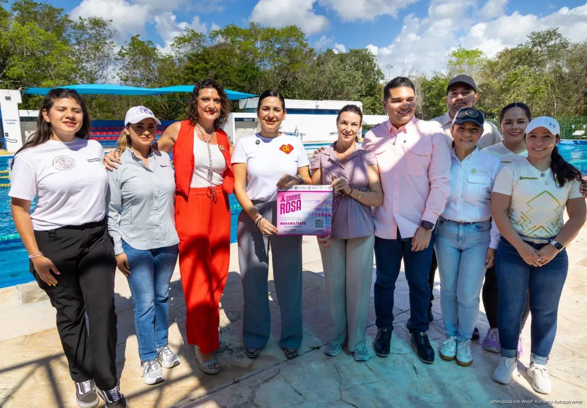 Playa del Carmen, Quintana Roo, 7 de abril de 2026.— La presidenta municipal Estefanía Mercado anunció el programa “Carril Rosa”, en la alberca olímpica de la Undiad Deportiva Riviera Maya, como parte de una iniciativa interinstitucional orientada a brindar atención especializada a mujeres que enfrentan problemas de salud derivados del linfedema, con prioridad para aquellas en situación de vulnerabilidad.