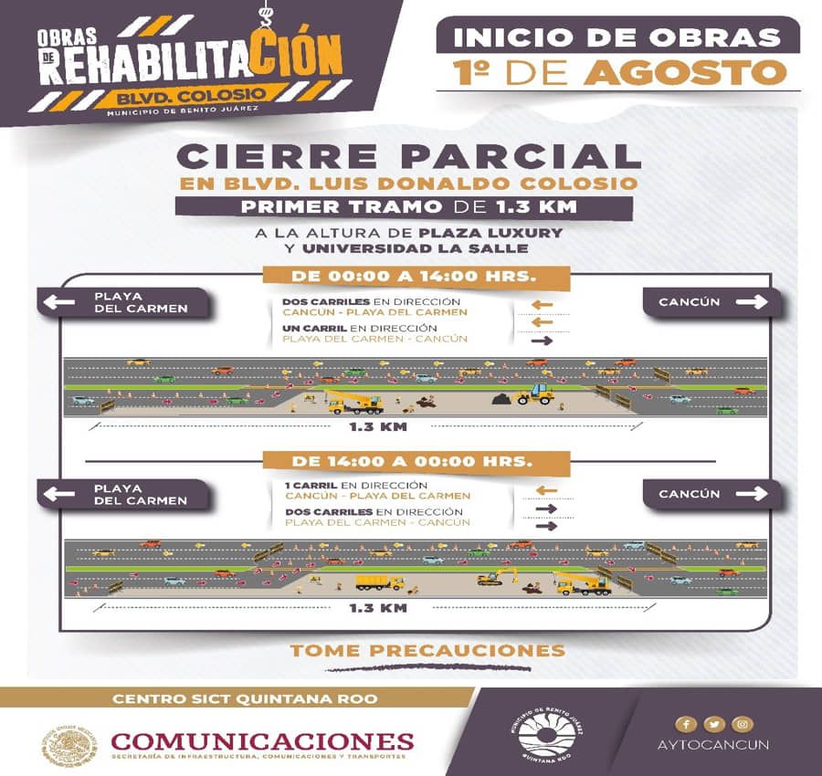 Cabe recordar que anticipadamente, se hicieron obras de adecuación para el desvío a contraflujo en el sentido sur a norte del aeropuerto hacia Cancún, ya que éste iniciará desde la altura de la Plaza Luxury y terminará por la Universidad La Salle Cancún, en donde los automóviles podrán reincorporarse a los tres carriles del Boulevard Colosio.