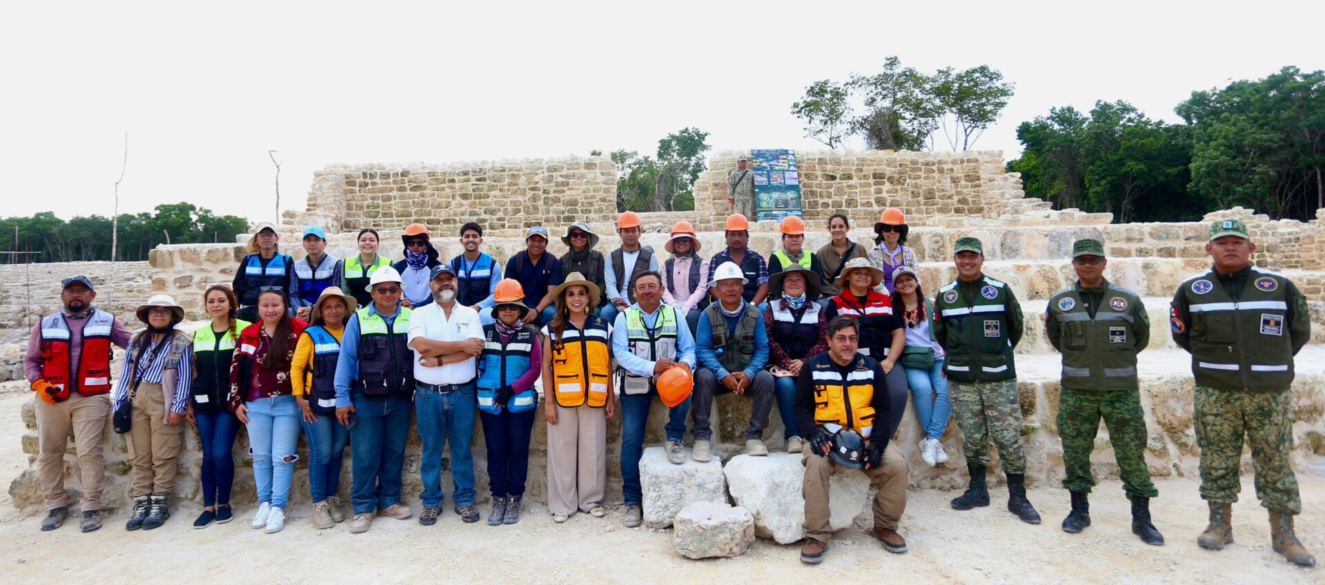 Acompañada de Margarito Molina, director del INAH Quintana Roo; Manuel Pérez Rivas, arqueólogo responsable del salvamento; y del coronel ingeniero constructor, Mario Acevedo Hernández, la gobernadora Mara Lezama recorrió la zona donde estará este nuevo Parque Arqueológico.
