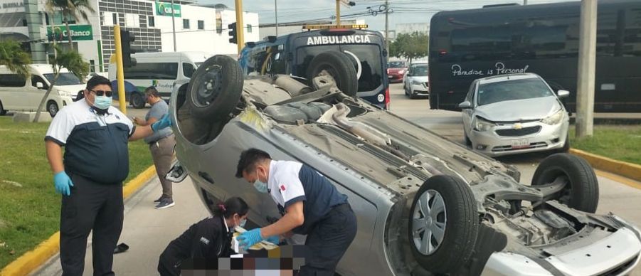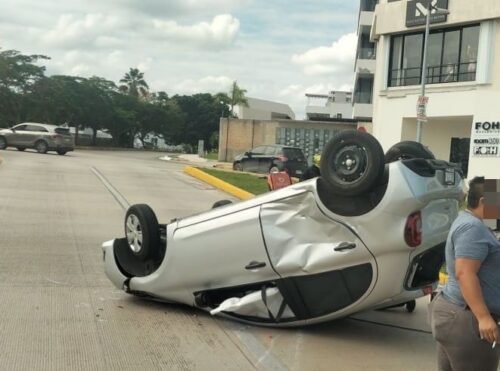CANCÚN, Quintana Roo, miércoles 7 de enero de 2026.—Un aparatoso accidente vial se registró la tarde de este miércoles en la glorieta Pioneros, ubicada en el cruce de la Avenida Tulum con la Avenida Contoy, luego de la colisión entre dos vehículos, lo que dejó como saldo una unidad volcada.