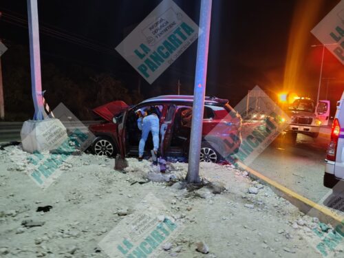 CANCÚN, Quintana Roo, 10 de agosto de 2025.- La noche de este sábado se registró un fuerte accidente sobre la carretera federal 307, a la altura del hotel Royalton, en dirección a Cancún, luego de que el conductor de una camioneta Suzuki Gran Vitara perdiera el control e impactara contra una estructura metálica de señalización en el retorno de acceso al complejo hotelero.