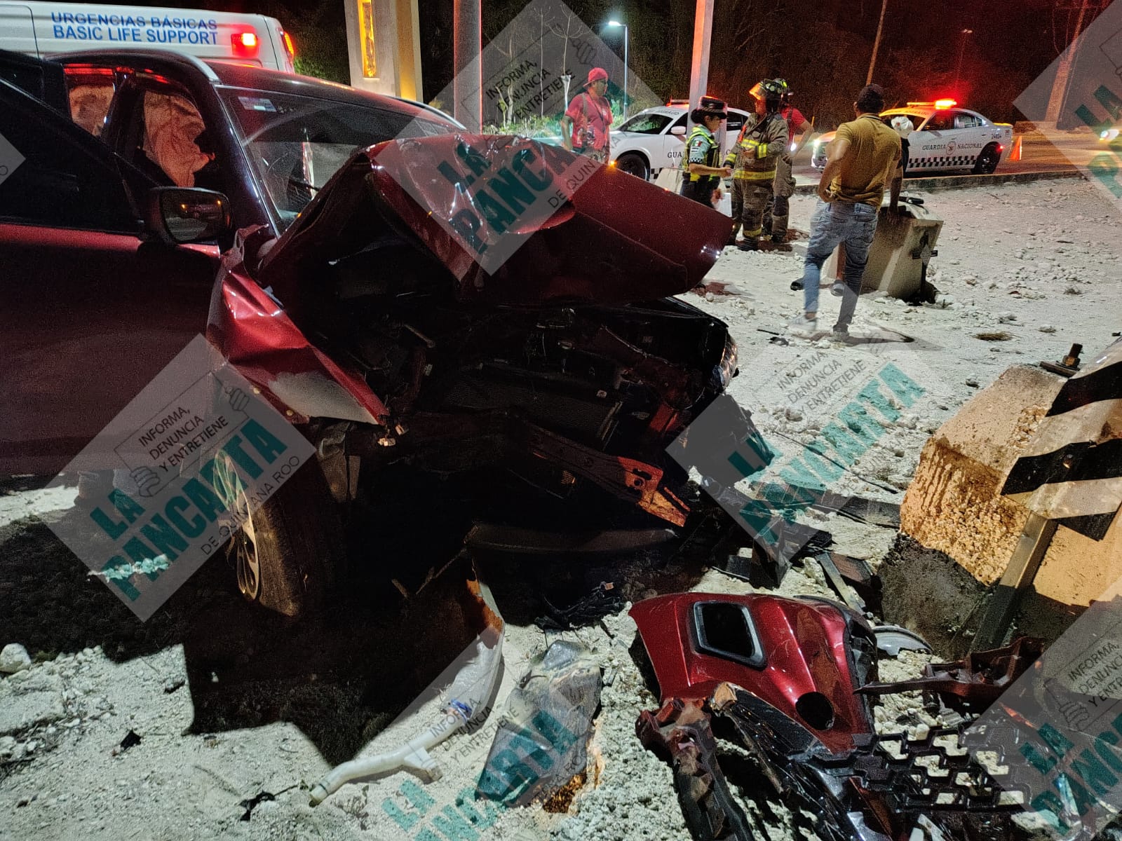 Testigos señalaron que el vehículo salió a exceso de velocidad desde la entrada del hotel e intentó incorporarse al carril con dirección a Playa del Carmen, pero en la maniobra el conductor circuló en sentido contrario, lo que ocasionó que montara el camellón central y se estrellara contra la señal metálica, causando severos daños materiales.