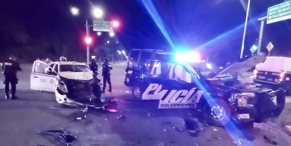 PLAYA DEL CARMEN, Quintana Roo, 23 de julio. – Un aparatoso accidente entre una patrulla de la Secretaría de Seguridad Pública y Tránsito y un taxi local dejaron como saldo a una mujer con dos piernas rotas y un ruletero sin dientes.