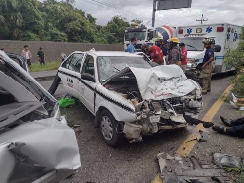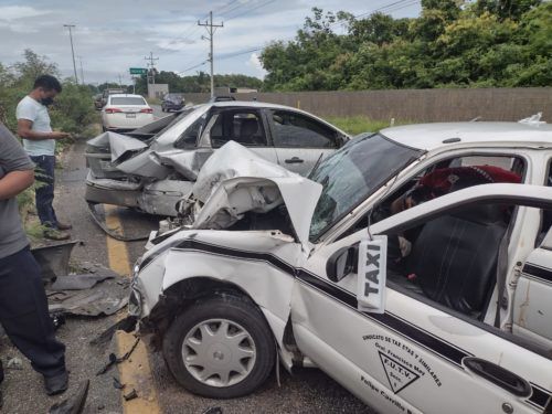 PLAYA DEL CARMEN, Quintana Roo, 17 de julio. – Cinco personas lesionadas entre ellas una niña, así como daños materiales superiores a los 90 mil pesos, fue el saldo de un aparatoso accidente de tránsito entre un taxi de Carrillo Puerto y un automóvil particular en tramo federal a la altura de Paamul; el hecho movilizó a los cuerpos de emergencias.