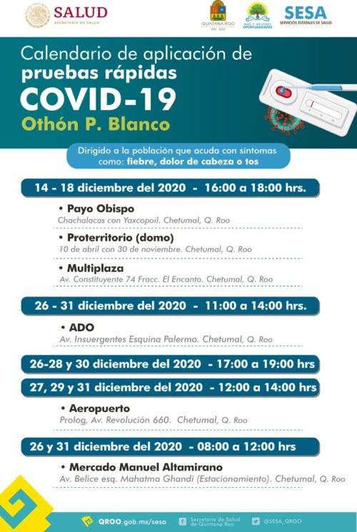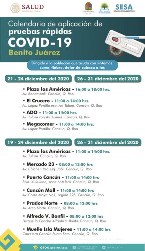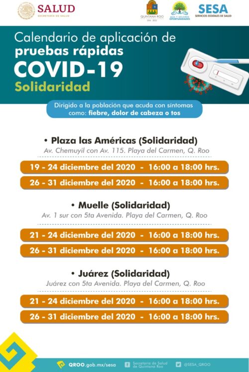 CANCÚN, Quintana Roo, 16 de diciembre.- La Secretaría de Salud de Quintana Roo anunció los calendarios de aplicación de pruebas rápidas para detectar COVID-19 en centros comerciales de Cancún, Playa del Carmen y Chetumal.