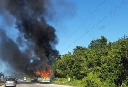 Bomberos de Tulum atendieron el reporte sobre un incendio de un autobús de transporte de personal sobre la carretera 307 Cancún- Chetumal a la altura del parque temático Xelha, pero poco pudieron hacer debido a que las llamas consumieron en su totalidad a la unidad.
