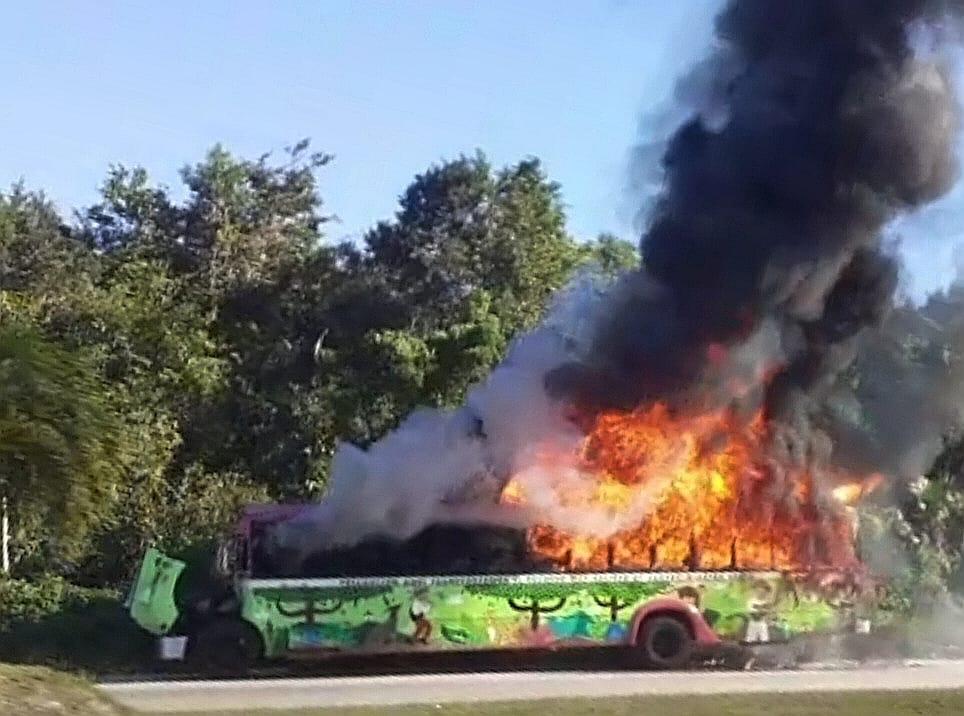 PLAYA DEL CARMEN, Quintana Roo, 3 de febrero.- Un corto circuito provocó que un camión de transporte de personal del Grupo Xcaret, ocasionó que ardiera en llamas, cuando circulaba sobre la carretera 307 en el tramo Playa del Carmen-Xelha, no se reportan personas lesionadas solo daños materiales, los bomberos sofocaron las llamas.