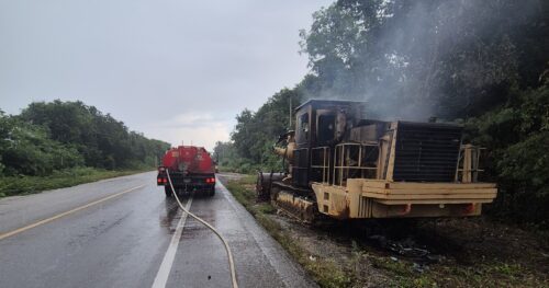 FELIPE CARRILLO PUERTO, Quintana Roo, 14 de noviembre de 2025.—Un incendio consumió una maquinaria pesada y un vehículo compacto en el libramiento de la carretera federal 307, a la altura del kilómetro 138+500, sin que se reportaran personas lesionadas, aunque las pérdidas materiales podrían superar los 300 mil pesos.