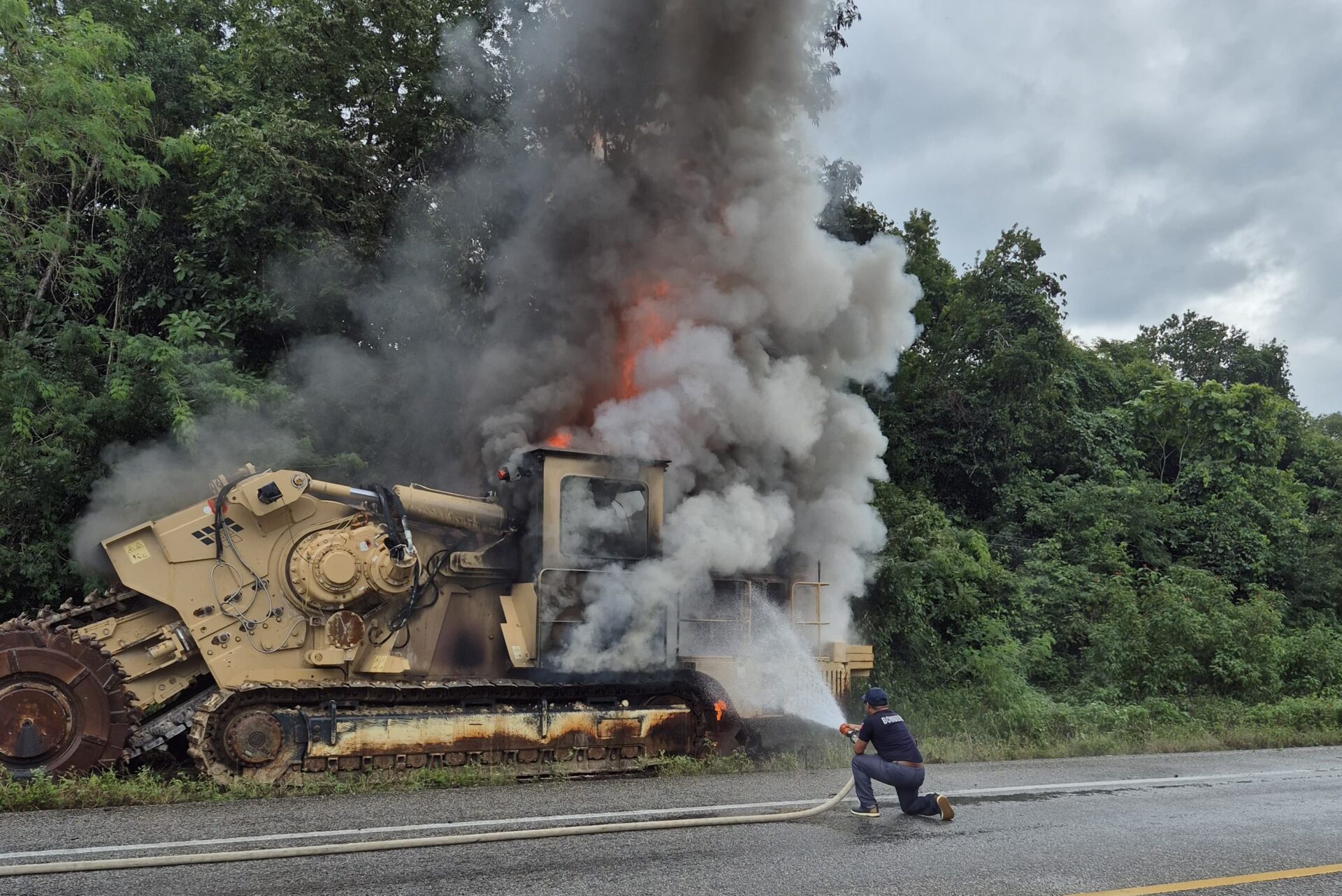 El incidente fue reportado alrededor de las 15:08 horas mediante una llamada ciudadana que alertó sobre un tractor en llamas en la salida a Tulum. Al llegar al sitio, los equipos de emergencia confirmaron que se trataba de una zanjadora industrial de grandes dimensiones, color marrón claro, la cual se encontraba estacionada a un costado del tramo federal sin algún responsable presente.