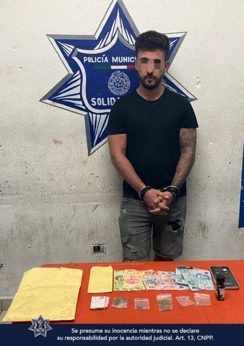 PLAYA DEL CARMEN, Quintana Roo, 30 de enero. – Durante el operativo conjunto de seguridad, prevención del delito y cumplimiento al Reglamento de fiscalización para que los establecimientos cierrena la hora estipulada, elementos de la Secretaría de Seguridad Pública de Solidaridad en coordinación con la Secretaría de la Defensa Nacional, Marina, Guardia Nacional y fiscales del Ayuntamiento de Solidaridad, aseguraron a un sujeto de origen extranjero en posesión de cuatro bolsas y un frasco de posibles narcóticos.