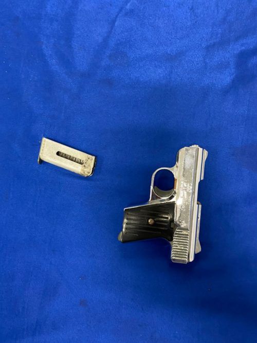 Al realizar una inspección al detenido, se le localizó un arma de fuego que contenía un cargador con 14 cartuchos útiles 09 milímetros, continuando con la inspección, se logró encontrar a unos 5 metros de dicha persona, una segunda arma de fuego, color plateada, con empuñadura color negro, con un cargador sin cartuchos al parecer calibre .25, asegurándose de forma inmediata.