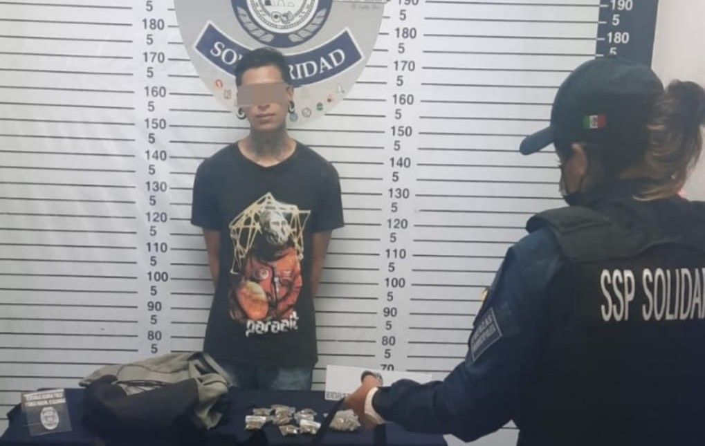 PLAYA DEL CARMEN, Quintana Roo, 30 de junio. – Policías de la Secretaría de Seguridad Pública y Tránsito Municipal de Solidaridad ubicados en el puesto de inspección preventiva a la entrada de la ciudad, aseguraron a un sujeto en posesión de 11 bolsitas con posible marihuana.