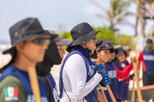 Tulum, Quintana Roo a 14 de julio de 2025. En respuesta al atípico arribo de sargazo que afecta a todo el estado, la Secretaría de MARINA envió un equipo de 70 elementos a Tulum para colaborar en la limpieza de sargazo en Punta Piedra. Este esfuerzo se une al trabajo diario que realiza el equipo de ZOFEMAT Municipal, quienes de forma permanente, desde muy tempranas horas realizan limpieza de las playas públicas.