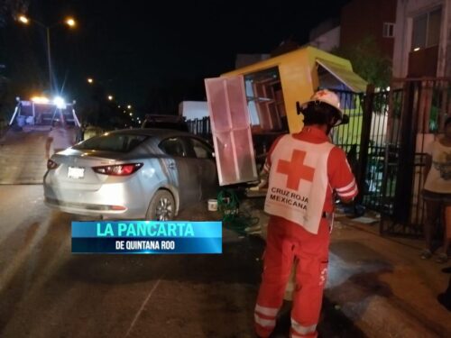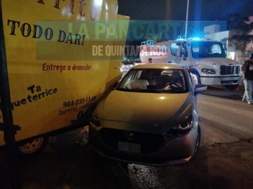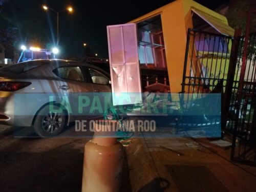PLAYA DEL CARMEN, Quintana Roo, 22 de abril. – El conductor de un lujoso automóvil tipo Mazda 2, colisionó un puesto de comida ambulante y lo proyectó contra las rejas de un domicilio, dejando como saldo, una persona lesionada y daños materiales superiores a los 100 mil pesos.
