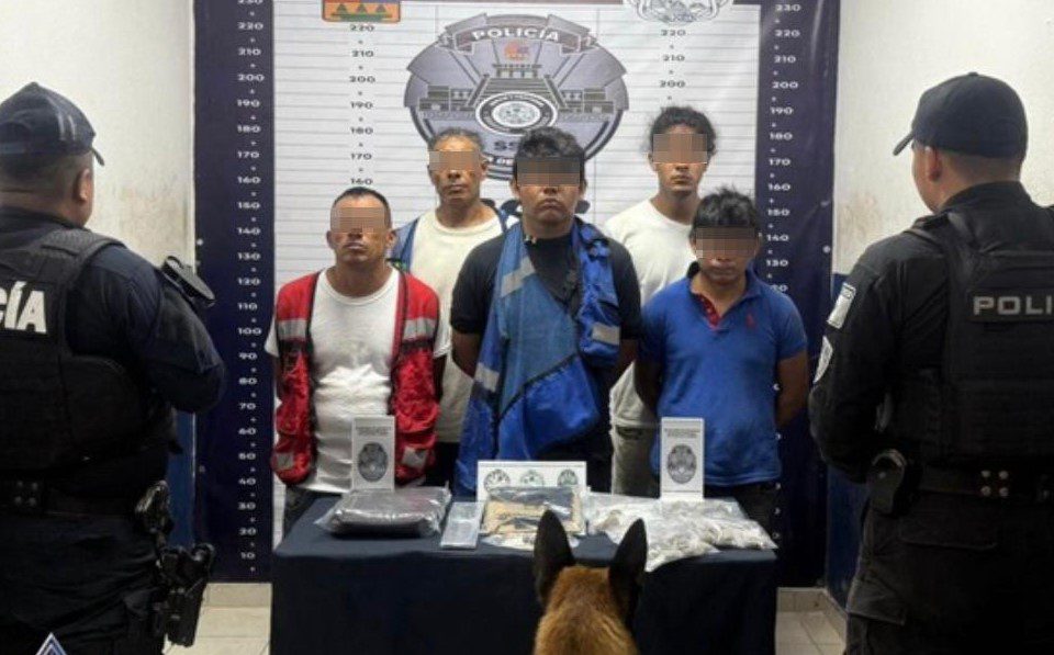 PLAYA DEL CARMEN, Quintana Roo 11 de mayo de 2025.- Elementos de la Secretaría de Seguridad Ciudadana de Playa del Carmen detuvieron a cinco personas por la probable comisión de delitos contra la salud y violación a la Ley Federal de Armas de Fuego y Explosivos, durante un operativo en el fraccionamiento Pescadores 2.