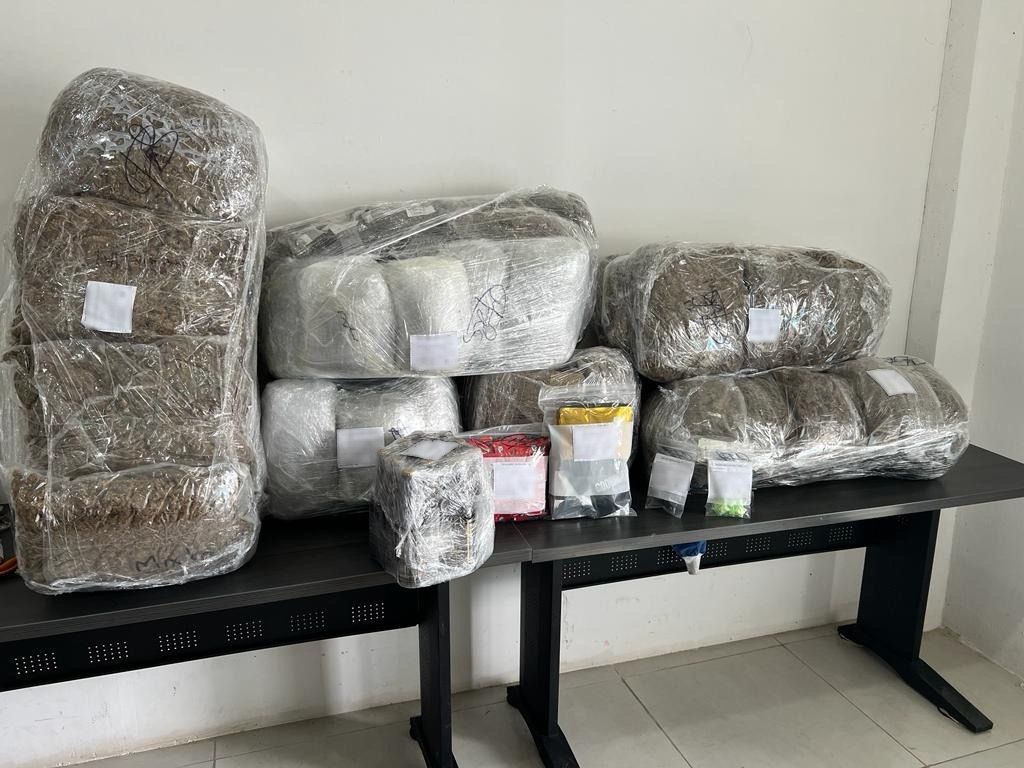 Durante el cateo, los agentes participantes aseguraron diversos envoltorios de material sintético que contenían hierba verde y seca con características similares a la marihuana, así como fragmentos de color blanco.