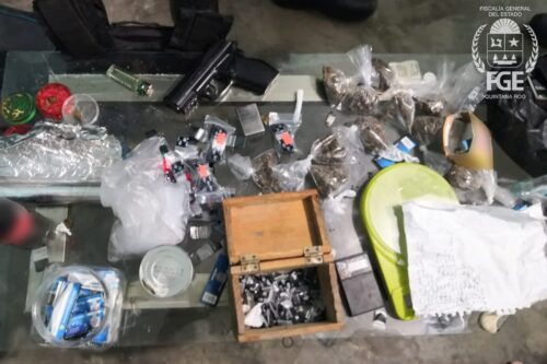 Elementos de la FGE aseguraron diversas drogas, objetos probablemente utilizados para la distribución del estupefaciente, una réplica de arma corta, un chaleco táctico y varios equipos celulares.