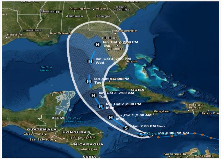 CHETUMAL, Quintana Roo, 24 de septiembre.- El Servicio Meteorológico Nacional emite Alerta Azul de Acercamiento (peligro bajo) por la tormenta tropical “Ian” del Mar Caribe, se ubica aproximadamente a 1,100 kilómetros al sureste de las costas de Quintana Roo, se desplaza hacia el Oeste noroeste, aproximándose gradualmente al occidente de Cuba sobre el Canal de Yucatán, presenta vientos máximos sostenidos cerca del centro de 75 km/h, y rachas de 95 km/h, se mueve al Oeste a razón de 26 km/h, por su evolución y trayectoria se mantiene en vigilancia.