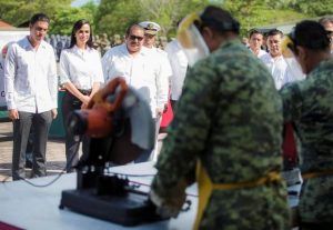 CANCÚN, Quintana Roo, 20 de enero.- La presidenta municipal de Puerto Morelos, Laura Fernández Piña, atestiguó esta mañana la destrucción de armas de fuego, que se llevó a cabo en el 64° Batallón de Infantería de esta ciudad, en ceremonia encabezada por el General de Brigada Diplomado de Estado Mayor, Gustavo Nieto Navarro, comandante de X Región Militar, con jurisdicción en Yucatán, Campeche y Quintana Roo.