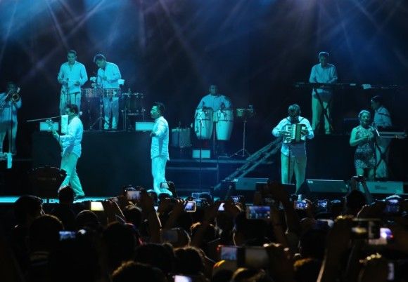 El grupo musical Los Ángeles Azules amenizó la noche al iniciar el concierto entorno a las 22:30 horas. La canción de apertura fue “Entrega de amor” que puso a bailar a miles de asistentes, seguido de “Las maravillas de mi vida”, “Cumbia pa´ gozar”, “Mi niña mujer”, “El listón de tu pelo”, “La cumbia del acordeón”, “Como te voy a olvidar”, “17 años” y “Mis sentimientos”.