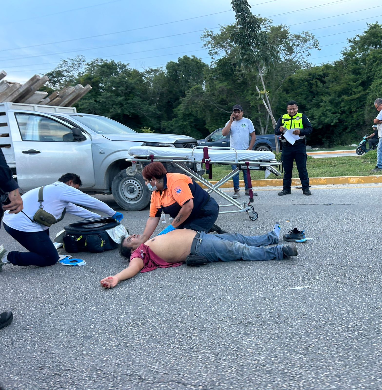 Los hechos ocurrieron en el boulevard Playa del Carmen, a la altura del hotel Grand Velas, cuándo varios automovilistas comenzaron a pedir el apoyo de una ambulancia luego de que un hombre que iba en una motocicleta, al pegarse mucho a una camioneta Nissan estaquitas, color gris, fue impactado por esta y cayó al pavimento.