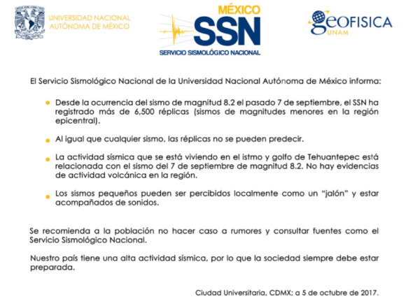 La ocurrencia de temblores en los estados de Chiapas y Oaxaca es frecuente y hasta la fecha no se cuenta con técnicas científicas en ninguna parte del mundo que puedan determinar cuándo o dónde ocurrirá un sismo, tampoco se puede saber qué tan grande será o qué efectos tendrá en la población, afirma. (FUENTE: El Excélsior)