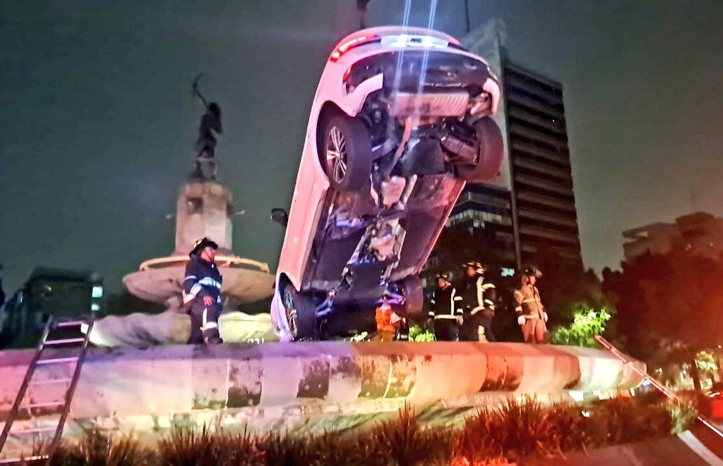 Un vehículo chocó en Paseo de la Reforma y quedó sobre la fuente de la Diana Cazadora en la Ciudad de México.