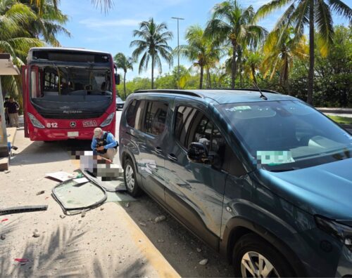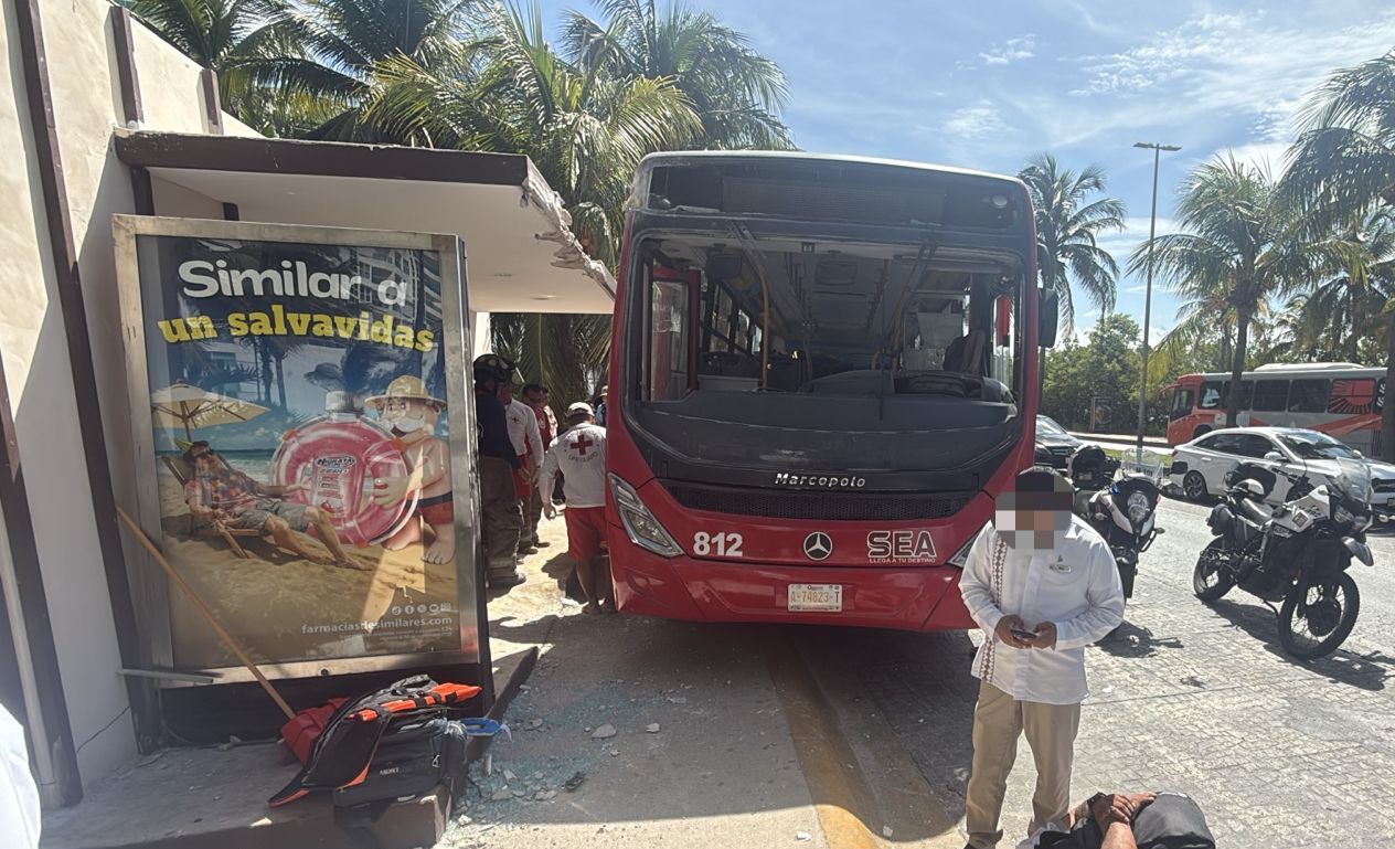 Cancún.- Un accidente registrado en el kilómetro 9.5 del bulevar Kukulcán dejó como saldo tres personas lesionadas, luego de que un autobús de transporte público perdiera el control al estacionarse e impactara la estructura de un paradero.