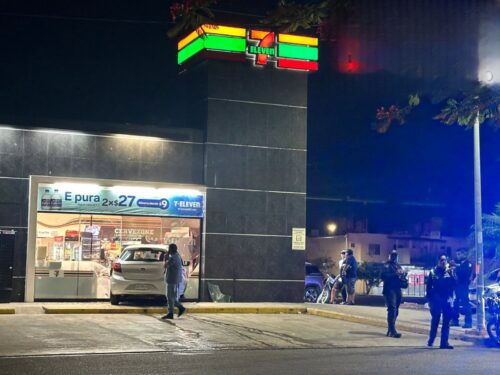 PLAYA DEL CARMEN, Quintana Roo, 05 de agosto de 2025.- Una joven conductora protagonizó un aparatoso accidente la noche de este lunes al impactar un vehículo contra la fachada de cristal de una tienda Seven Eleven, ubicada en el fraccionamiento Cataluña, en la avenida 28 de Julio.